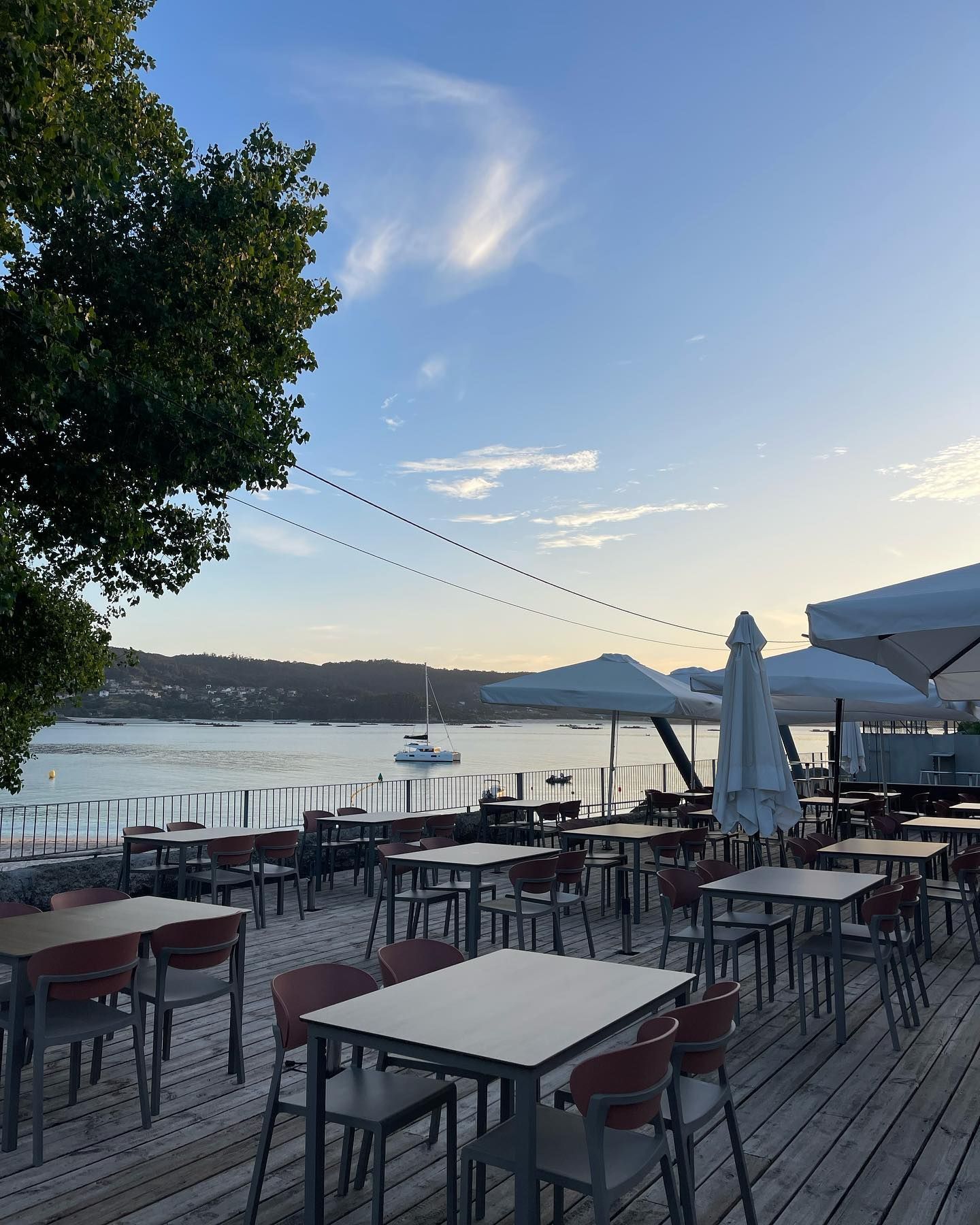En la playa de Menduiña, en Aldán, encontrarás nuestro espacio en tierra firme: un lugar abierto, luminoso y frente a una de las playas más tranquilas de la ría. Aquí el verano se vive sin prisas, entre cafés al sol, comidas después de la playa y atardeceres que invitan a quedarse.